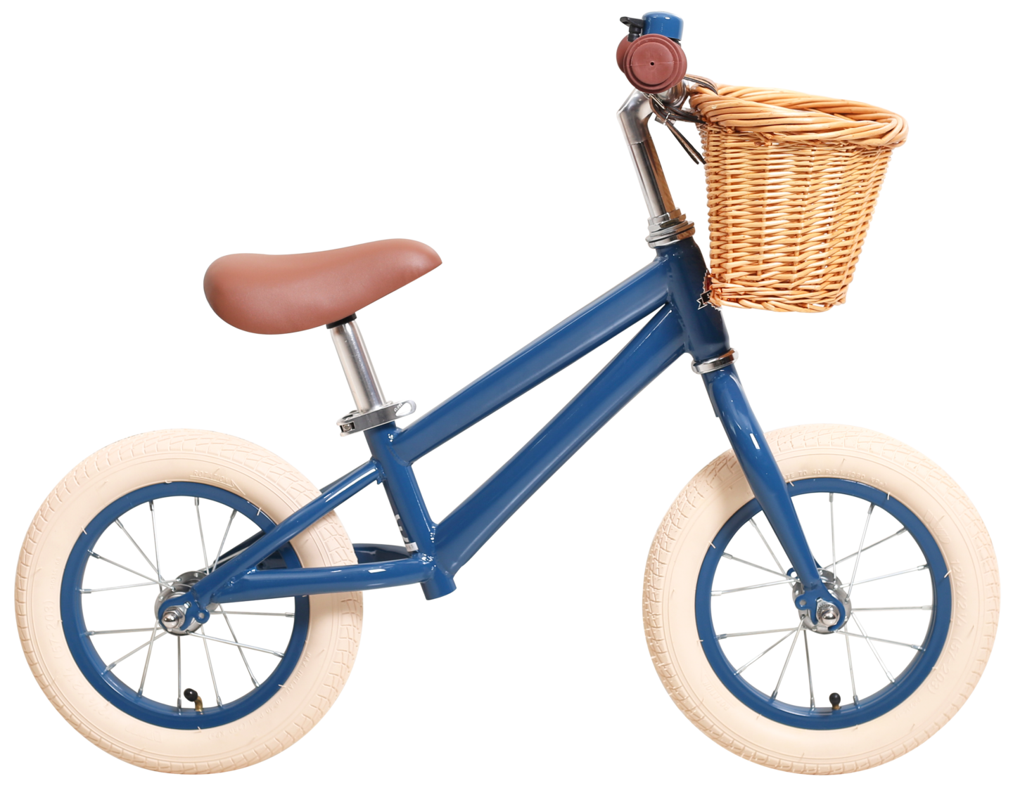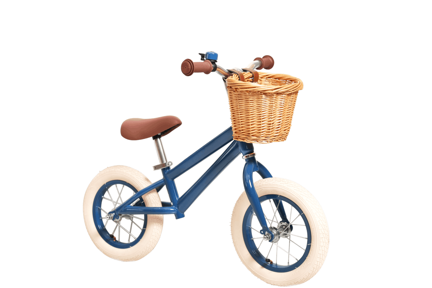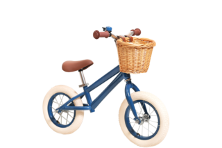 In mini format, this titbit has the same lovely design and quality as our adult bikes. Deep blue frame with matching rims and bell. Brown saddle and beige rubber tires. Yum!This little bike is delivered fully assembled and the bicycle basket is included.