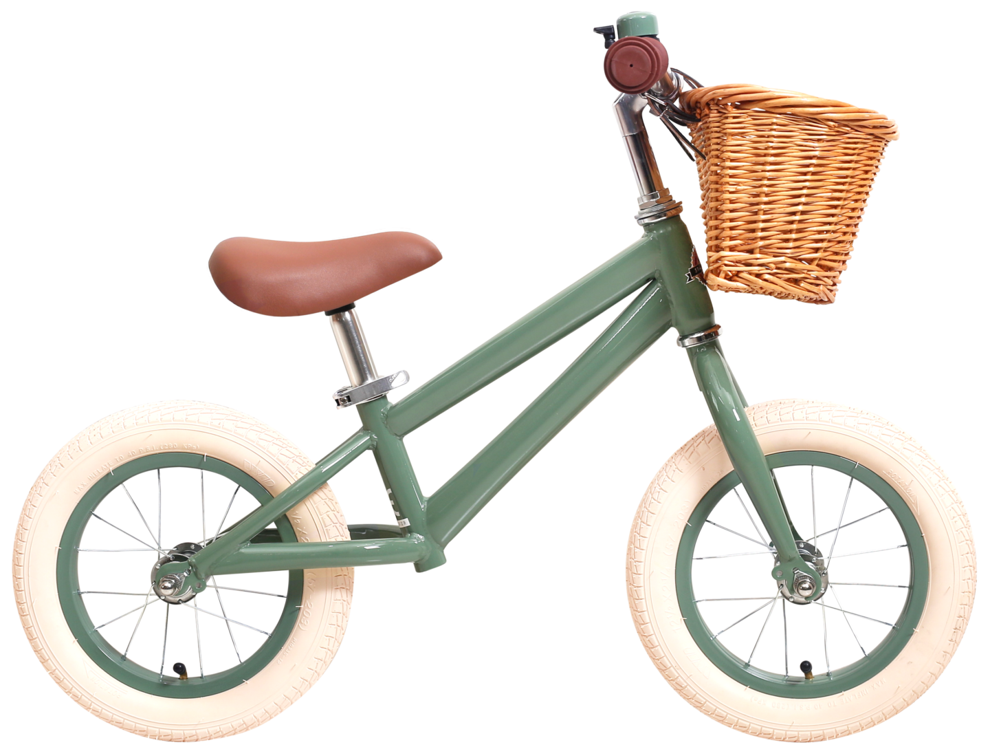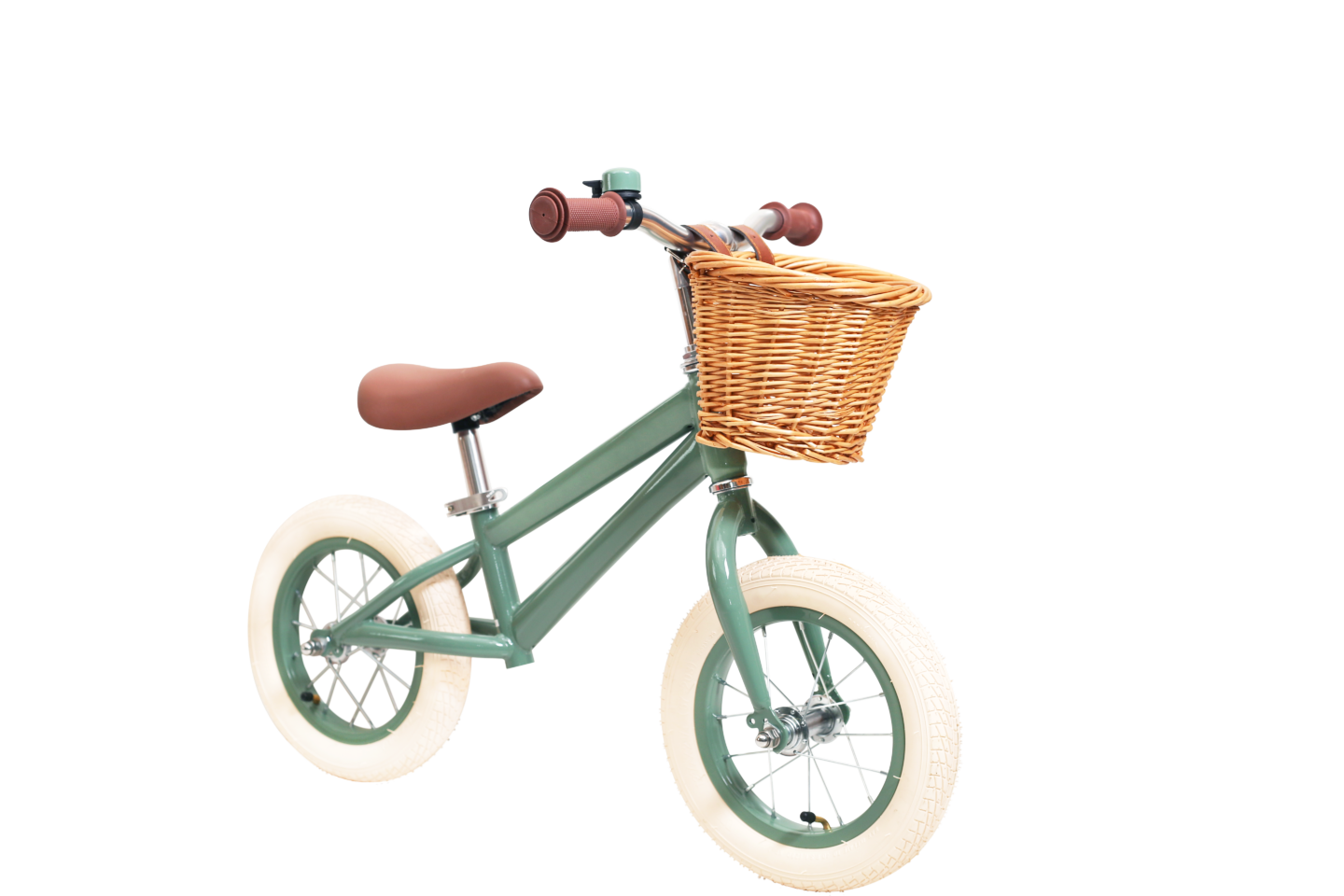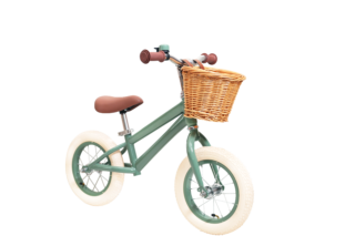 In mini format, this titbit has the same lovely design and quality as our adult bikes. Green frame with matching rims and bell. Brown saddle and beige rubber tires. Yum!This little bike is delivered fully assembled and the bicycle basket is included.