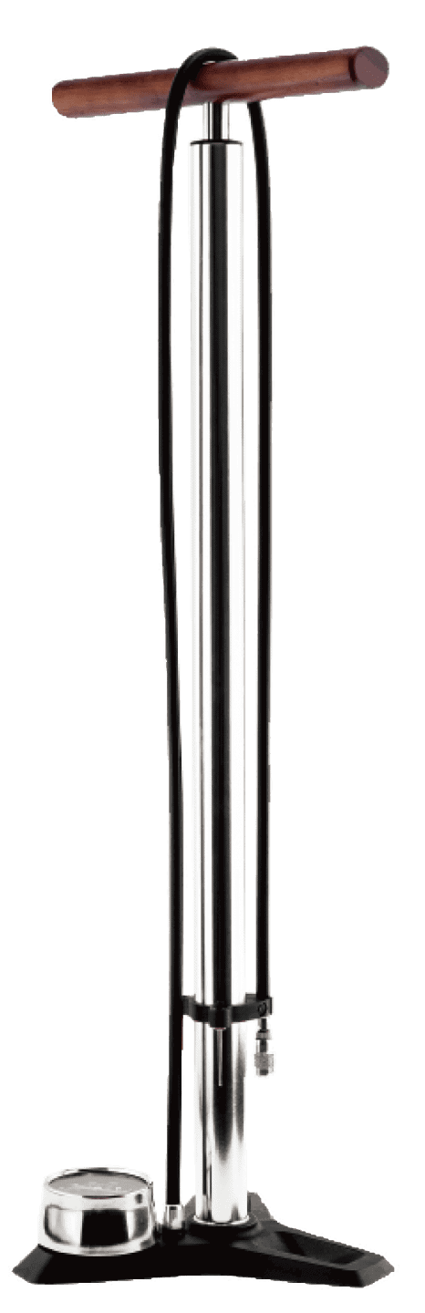 Stålhästen retropump i rostfritt stål och med hickoryträhandtag. Fotpumpen klarar pumpa både bilventil, racerventil och standardventiler. Det medföljer adapter för fotboll och luftmadrass.