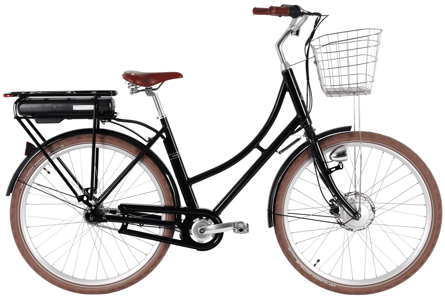 Prima elcykel är också något så ovanligt som en stilig elcykel, om vi tillåts säga det själva. Samma vackra ram som modell Prima, men anpassad för att klara av elektrifieringens krav. Dessutom med sitt batteri i en pakethållaren, så att du slipper cykla runt med en stor plastklump där bak. Självklart är det löstagbart, du behöver inte oroa dig för att behöva kånka hela cykeln till närmaste eluttag när den ska laddas 😃