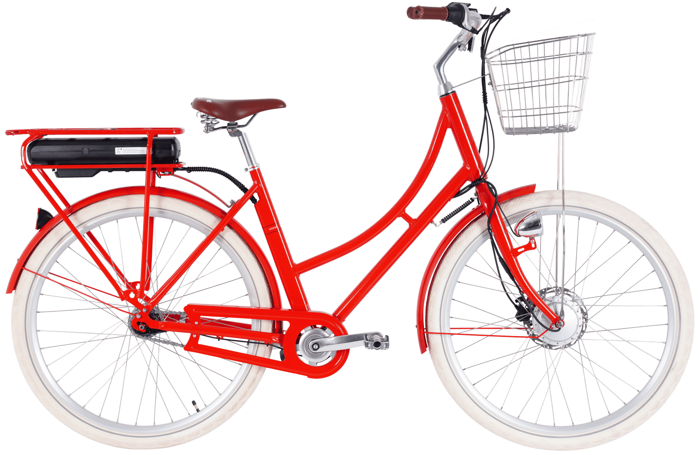 Prima elcykel är också något så ovanligt som en stilig elcykel, om vi tillåts säga det själva. Samma vackra ram som modell Prima, men anpassad för att klara av elektrifieringens krav. Dessutom med sitt batteri i en pakethållaren, så att du slipper cykla runt med en stor plastklump där bak. Självklart är det löstagbart, du behöver inte oroa dig för att behöva kånka hela cykeln till närmaste eluttag när den ska laddas 😃