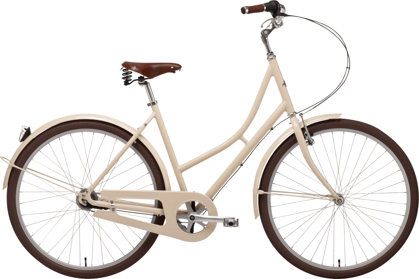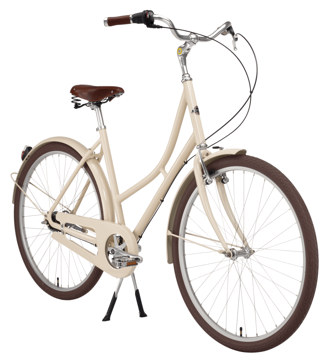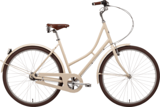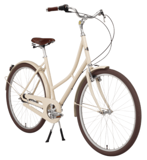Prima Cream kommer med 7-växlar, aluminiumram, fot- och frambroms, metallpedaler, dubbelstöd, baklampa och ringklocka.