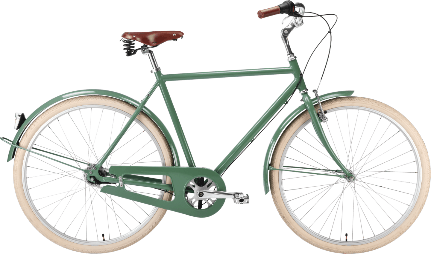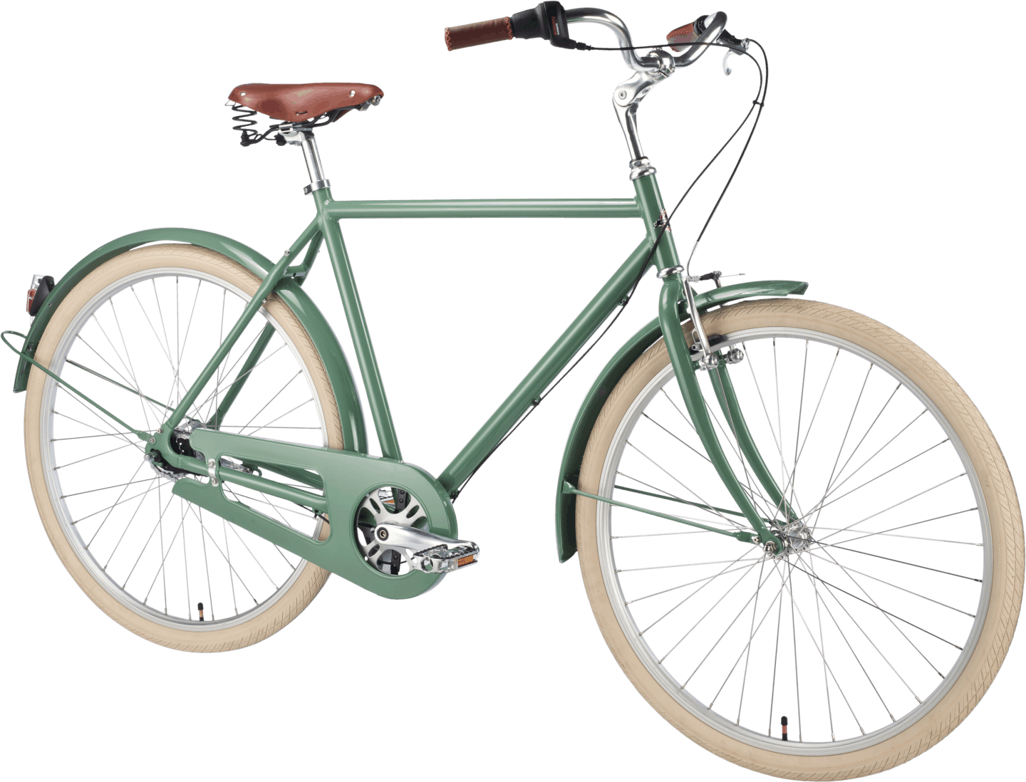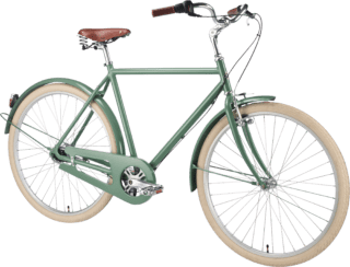 Prima grön kommer med 3-växlar, aluminiumram, fot- och frambroms, metallpedaler, dubbelstöd, baklampa och ringklocka.