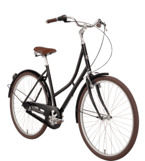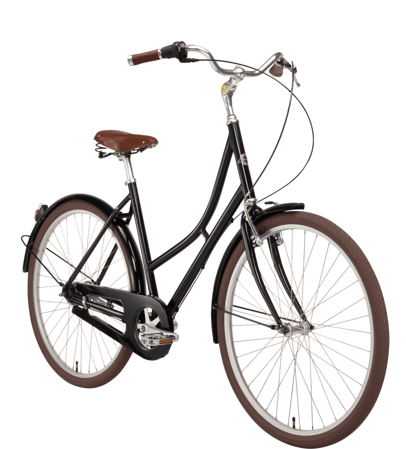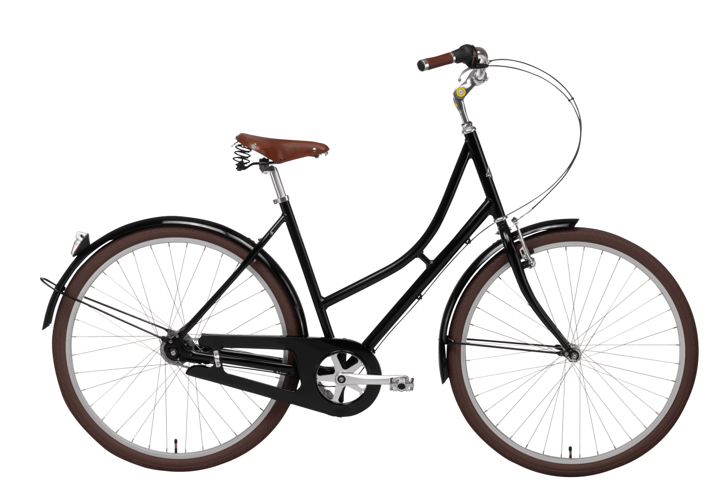 Prima Svart kommer med 3-växlar, aluminiumram, fot- och frambroms, metallpedaler, enkelstöd, baklampa och ringklocka.