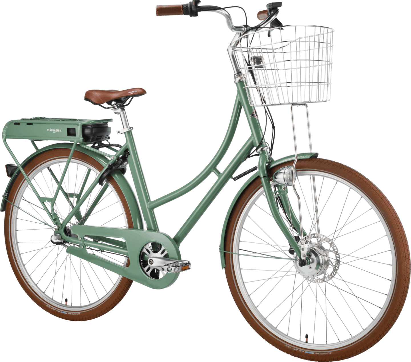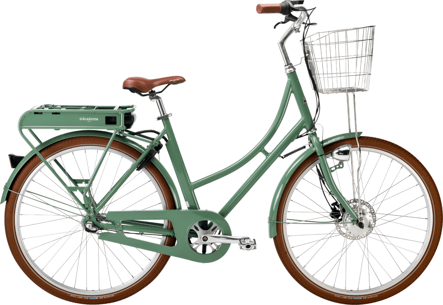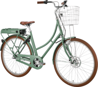 Prima elcykel är också något så ovanligt som en stilig elcykel, om vi tillåts säga det själva. Samma vackra ram som modell Prima, men anpassad för att klara av elektrifieringens krav. Dessutom med sitt batteri gömt i en aluminiumlåda på pakethållaren, så att du slipper cykla runt med en stor plastklump där bak. Självklart är det löstagbart, du behöver inte oroa dig för att behöva kånka hela cykeln till närmaste eluttag när den ska laddas 😃